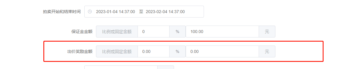 12、出价奖励金额:自定义比例或固定金额,参与出价的会员未拍得商品可以获得出价奖励,加一口价 *自定义比例