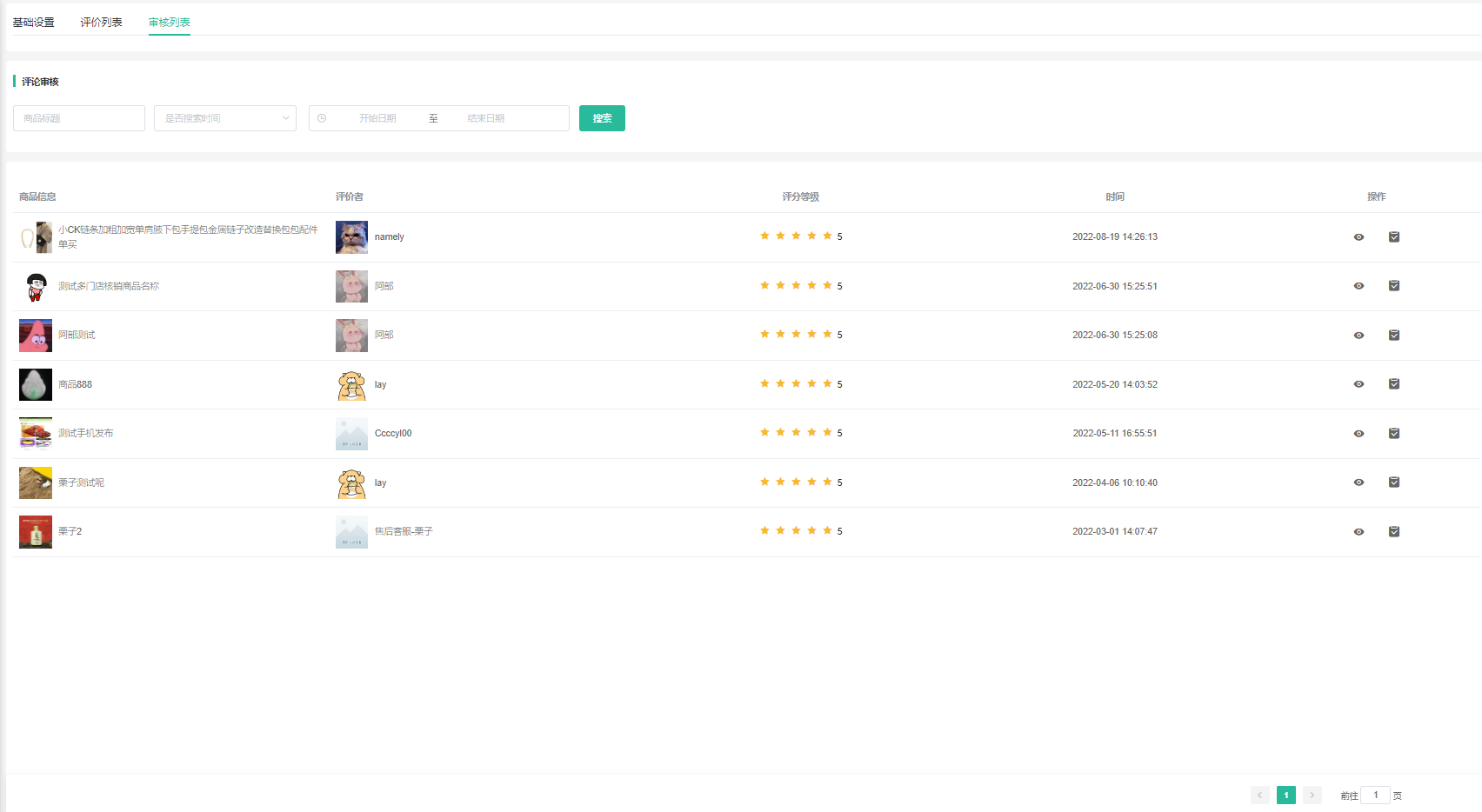 支持查看会员商品评价、是否通过审核、是否显示、是否置顶。