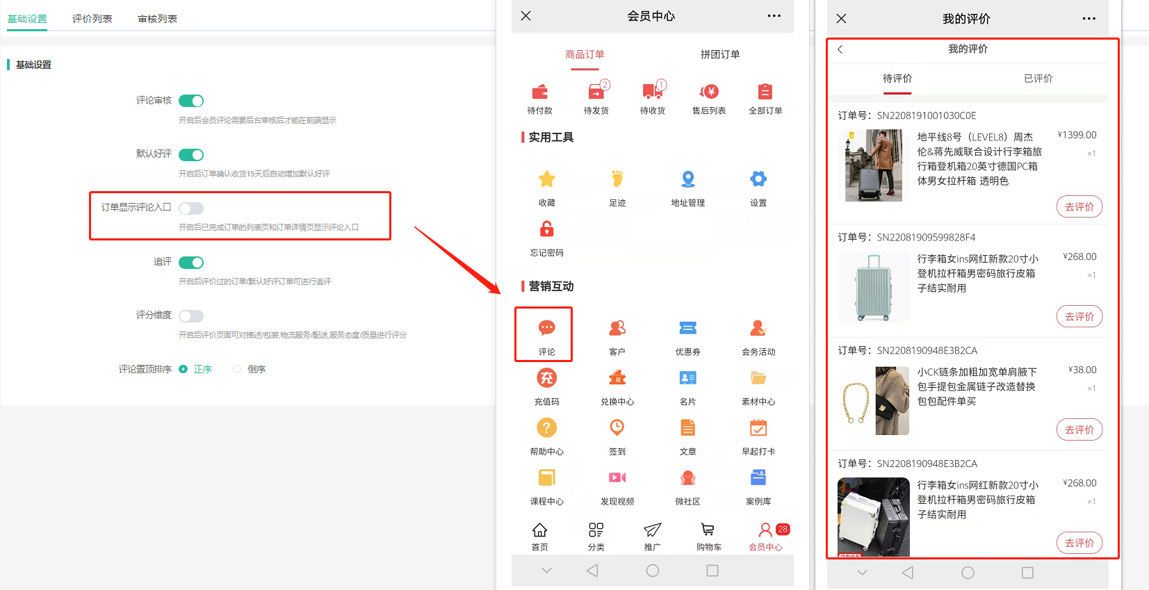 开启后已完成订单的列表页和订单详情页显示评论入口。