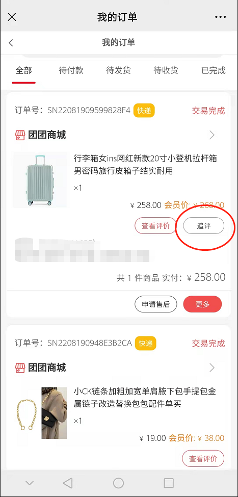 开启后评价过的订单/默认好评订单可进行追评,可以在我的订单,或我的评价可以看到追评入口,效果如下.